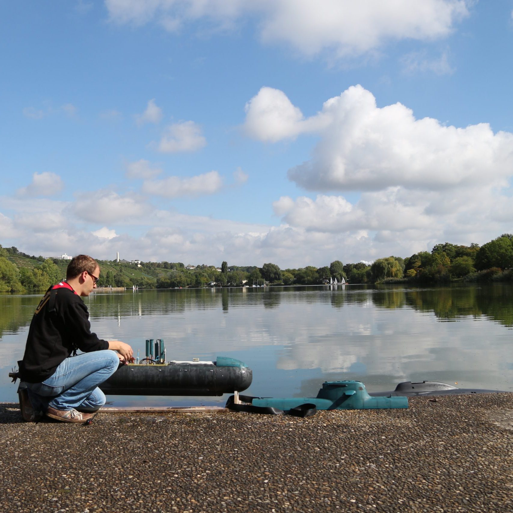 12:40 PM: Sascha wanted to tow a boat with his tugboat. So, he hooked up Egon’s A11. But since he only had one rope and attached it to the right tower rudder, it didn’t work very well. Once in motion, the 42 kg submarine just wanted to go straight ahead. The tugboat had enormous trouble forcing the boat to turn.
