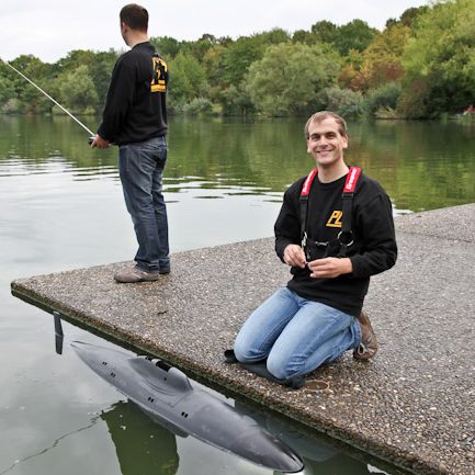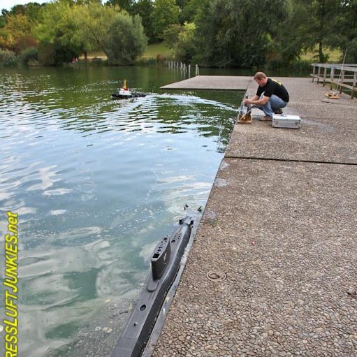 Ein perfekter Steg an einem nahezu perfekten Wasser. Direkt am Steg ist das Wasser schon sehr tief, so dass man auch getaucht 30cm vorm Steg fahren kann. Sascha und ich zogen unsere Runden und beobachteten unsere Boote genau. Die Sciré musste, wie auch die Makrele, noch etwas genauer eingestellt werden. Egon kämpfte derweil mal wieder mit den Blubberblasen. Er sollte da endlich mal rangehen. Markus Utsira lief zuverlässig wie die deutsche Bahn.