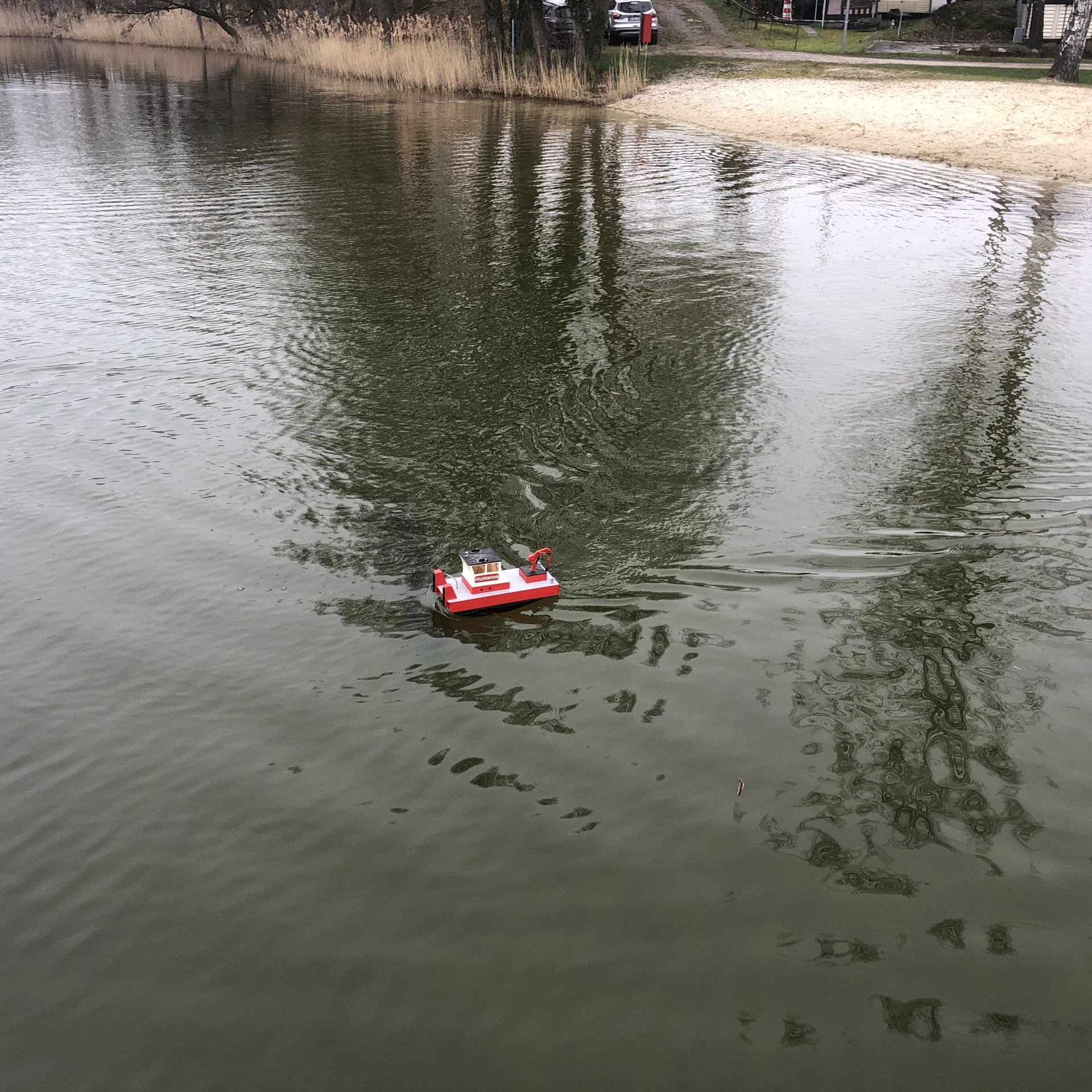 I brought along the Nebraska and was able to test the boat for the first time in open water. As expected, it runs smoothly, and the sleek boat made its fast rounds. There is a minor leak at the rear O-ring, which probably needs to be replaced after such a long time. However, due to its size and weight, it’s a boat that can easily be taken to the lake. Of course, over the weekend, the Easter Bunny also stopped by the lake, much to the delight of the kids.