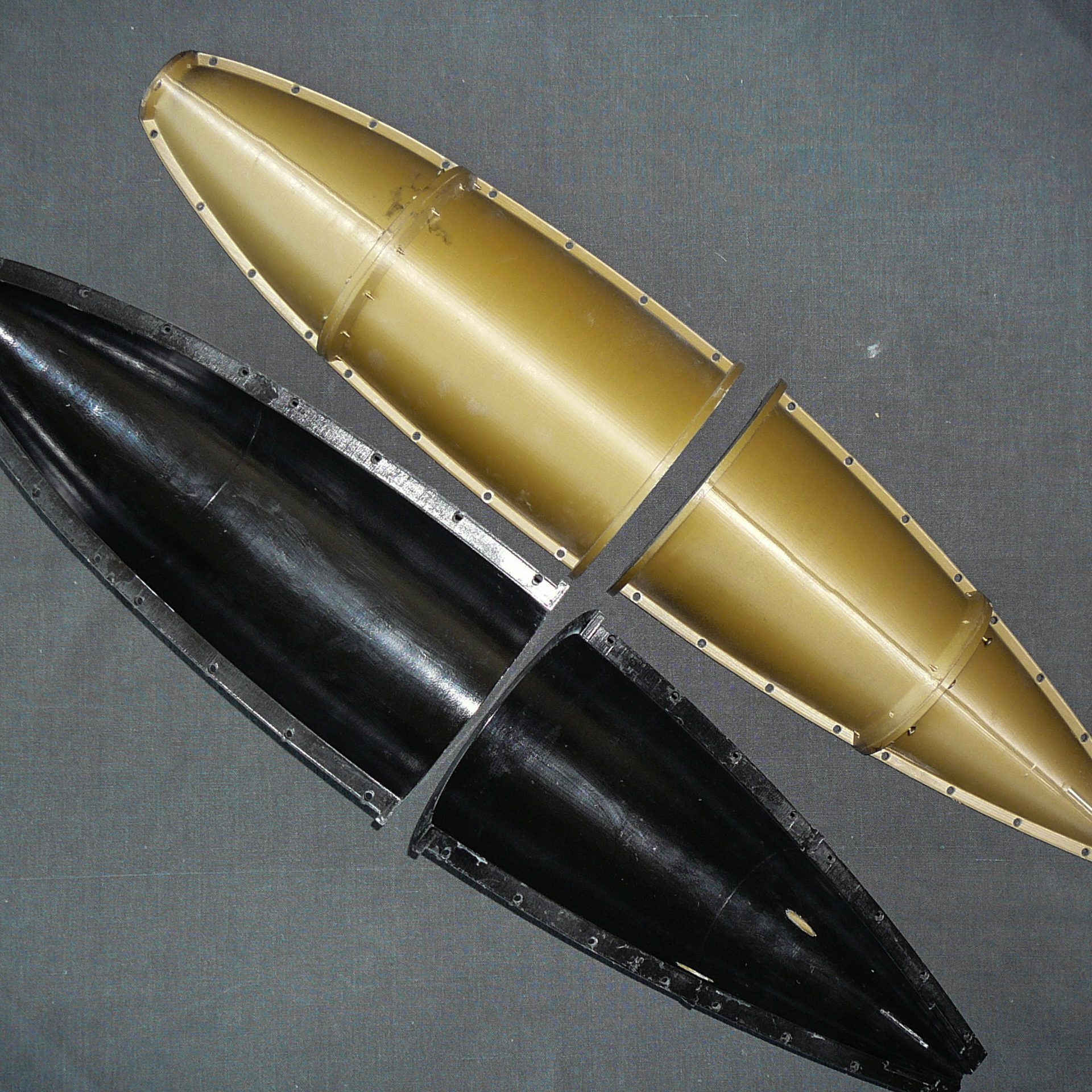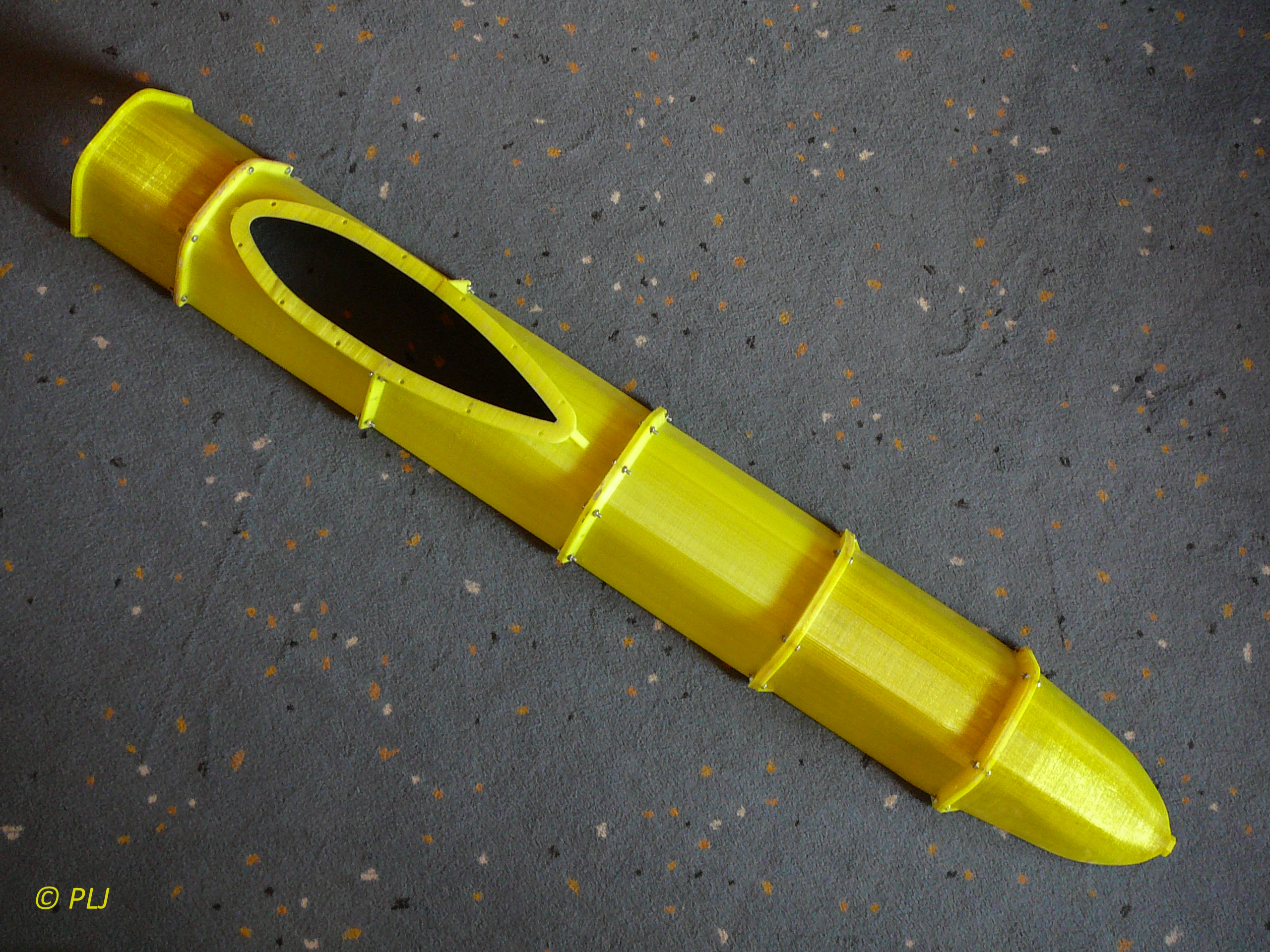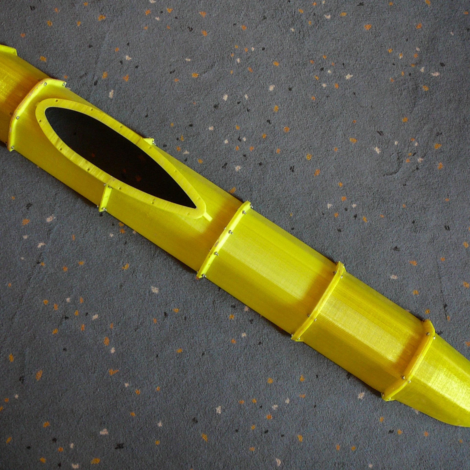 Dafür ist zunächst eine Zeichnung nötig. Ausgehend von einigen Spanten und Längslinien ist ein einfacher Rumpf schnell gezeichnet. Darum wird dann eine Hülle von 4 bis 5 mm Stärke gelegt. In diese Hülle können wichtige Details wie Bohrungen für Ruderachsen, Deckdurchbrüche und Markierungen „eingebaut“ werden. An den Bereichen wo die Trennlinien verlaufen sollen, werden Verstärkungen dran gezeichnet, damit stabilere Kanten zum Drucken und späterem Zusammenbau entstehen. Löcher für Schrauben und Stifte nicht vergessen. Die Größe des Druckers bestimmt die Trennbereiche. Gedruckt wurden meine Formen mit PLA in 0,2mm Schichthöhe. Formteile die später nicht getrennt werden müssen, können verklebt und verschraubt werden. Die Oberflächen mit 80er Schleifpapier etwas überschleifen. Mit Nitrospachtel dünn verspachteln. Schleifen, nachspachteln, erneut schleifen. Grundieren, lackieren. Das sollte reichen.