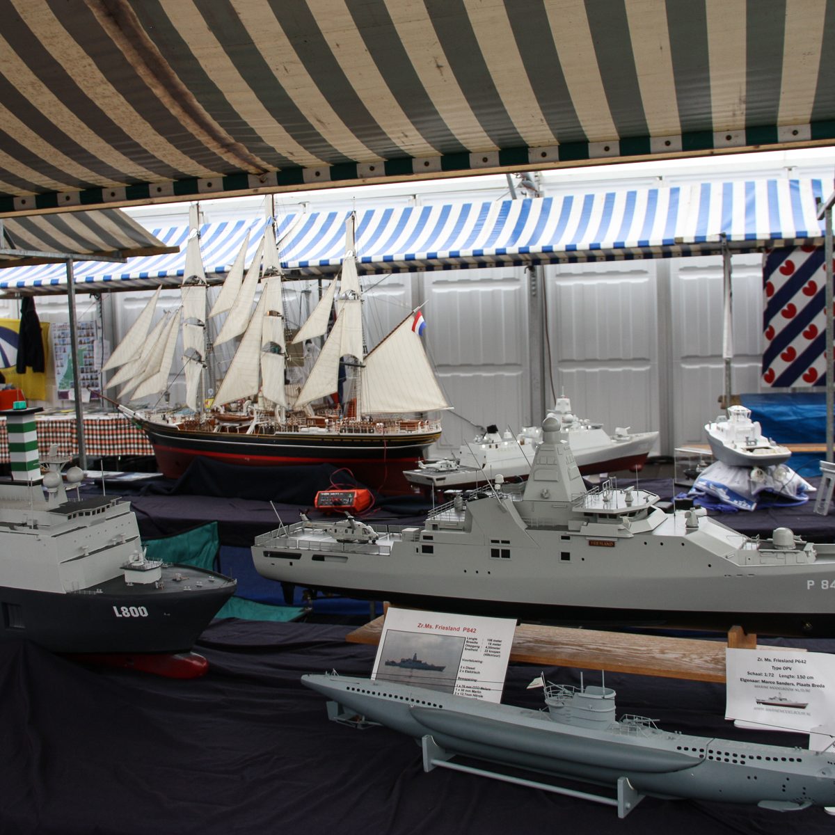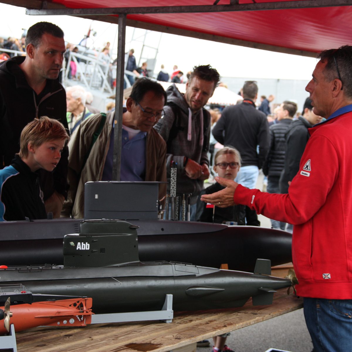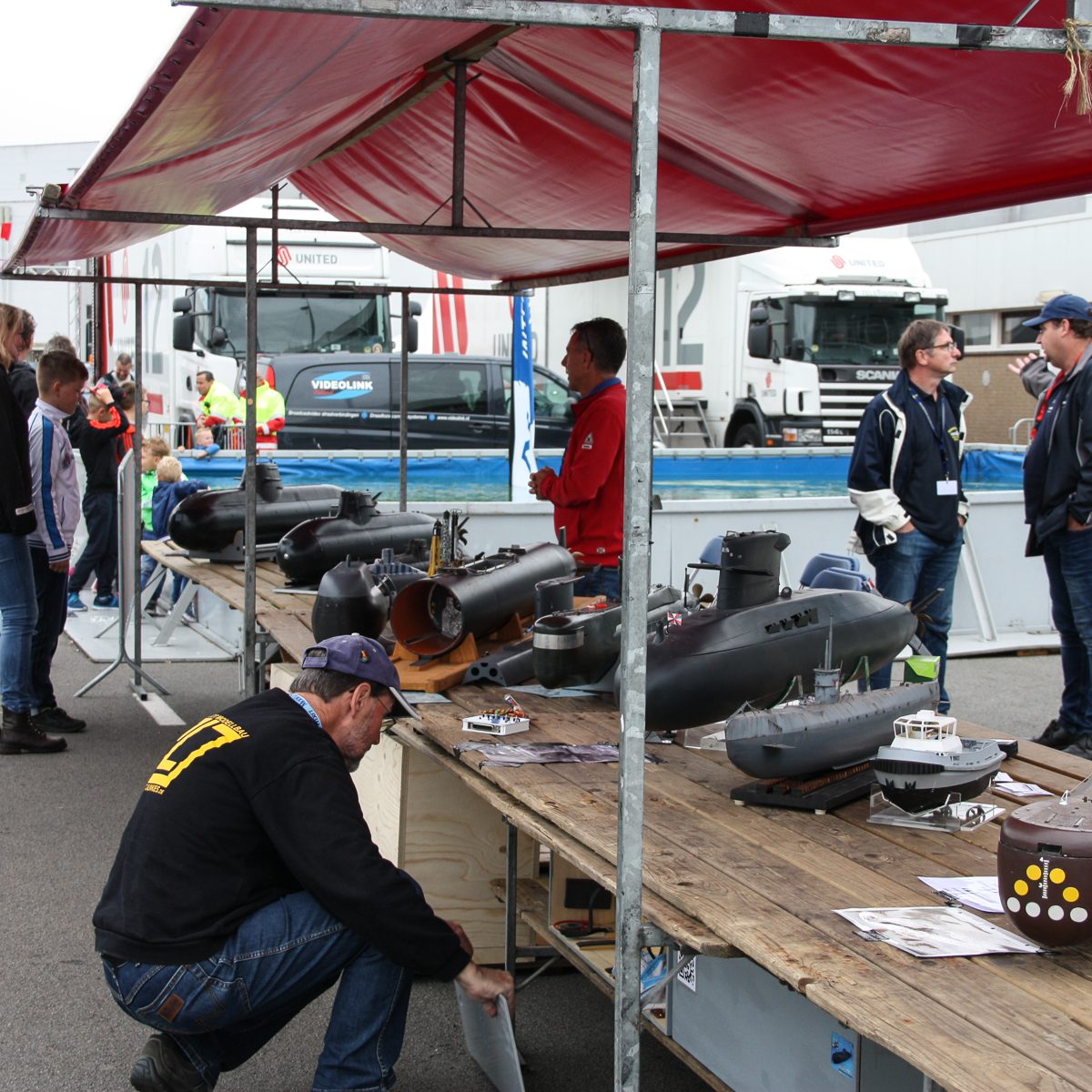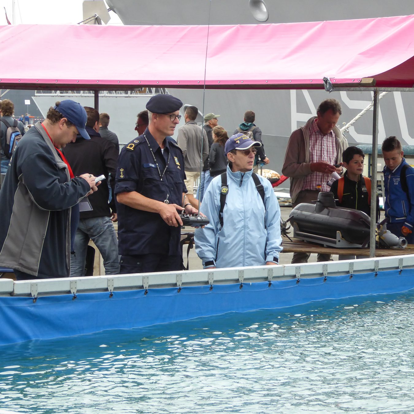 Am Abend durften wir unsere Modelle im Gebäude des Onderzeedienses unterstellen, das ersparte uns das erneute Verladen in die Autos. Am Freitagmorgen begann dann die eigentliche SAIL und die Menschenmassen strömten nur so auf das Gelände. Wir hatten zusammen mit Leon und Rob vom MMN den Stand beschickt. Nach einer Weile stieß noch Freek vom MMI dazu und nachmittags kamen auch noch Klaus und Markus als Gäste des MMI. Dann war unsere kleine aber feine Flotte komplett. Das Fahren im recht kleinen Wasserbecken erwies sich als nicht so einfach, gerade die großen Boote konnten nur vorsichtig ihre Runden drehen. So versuchten wir die Zuschauer mit den kleinen Booten zu unterhalten.