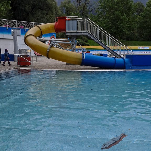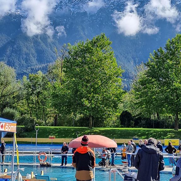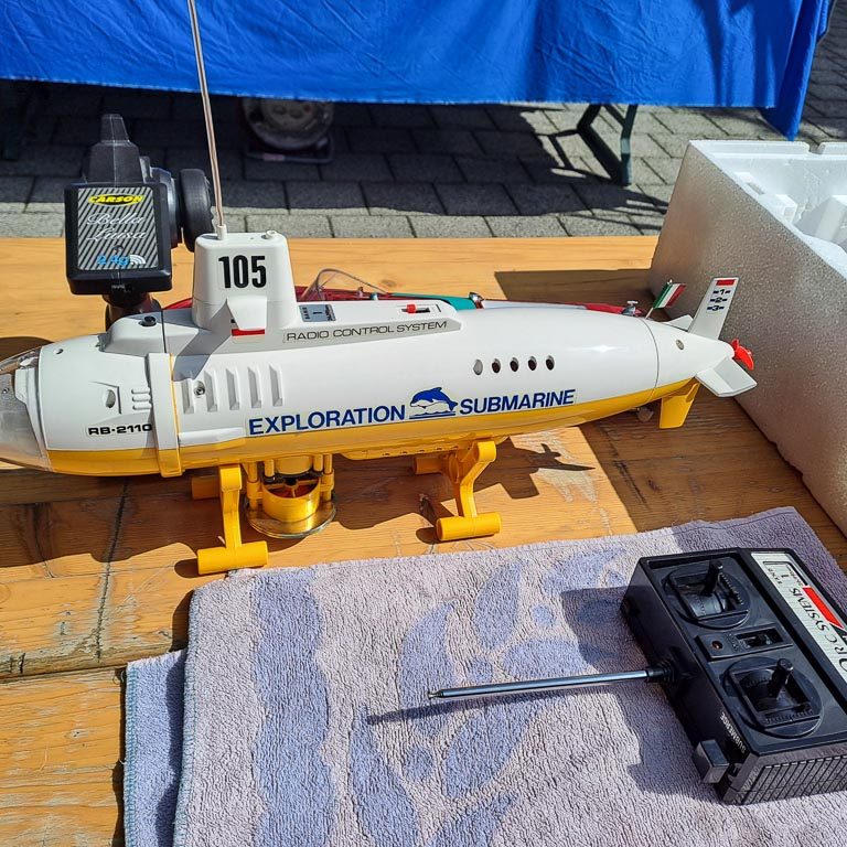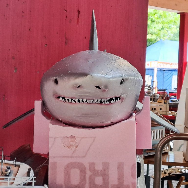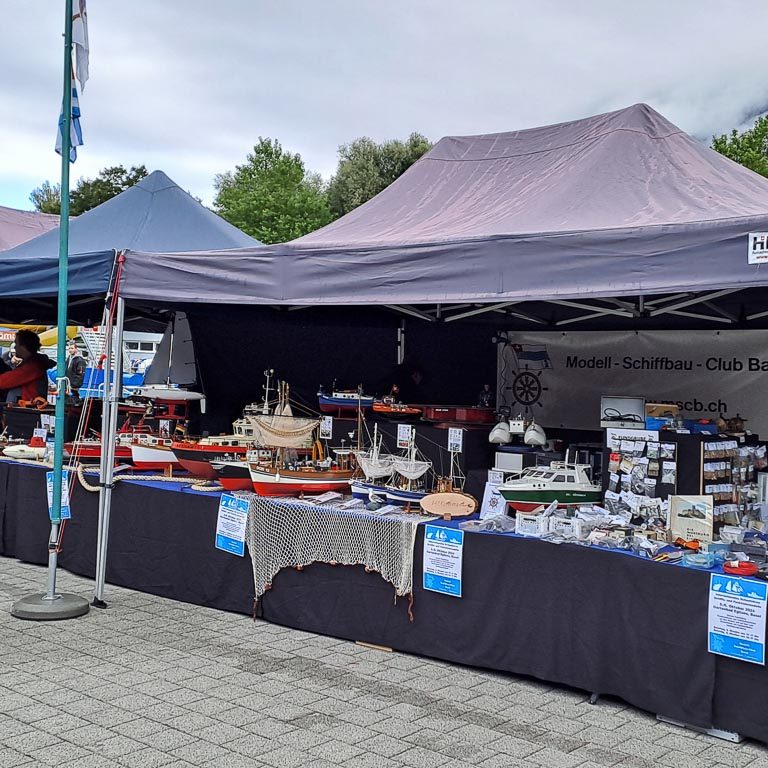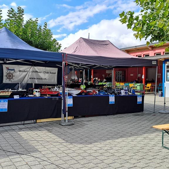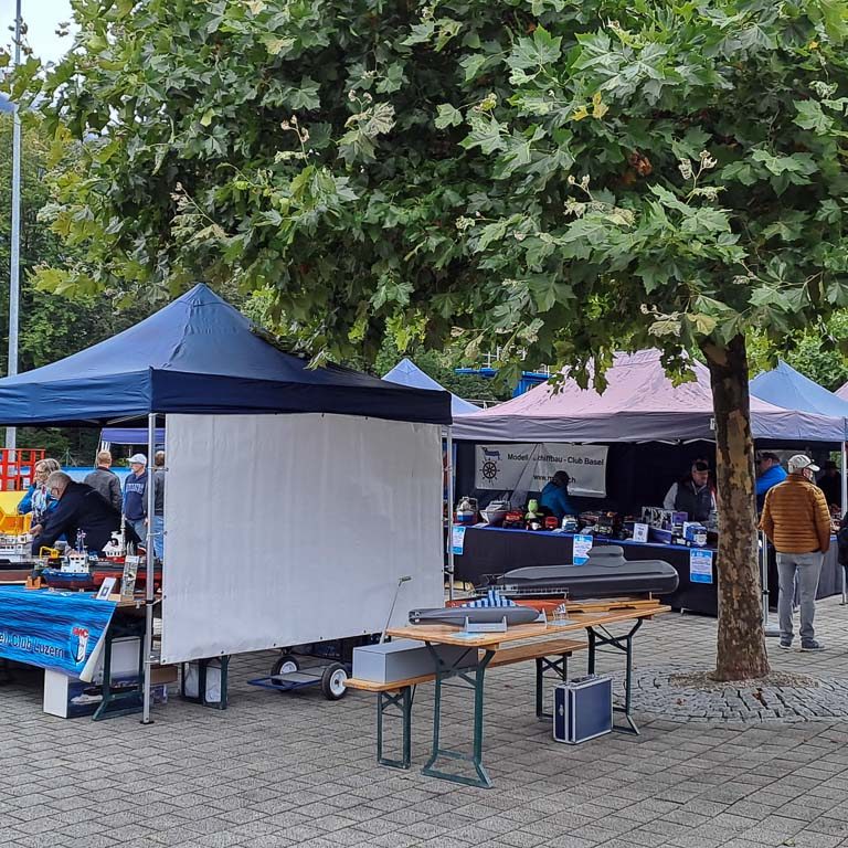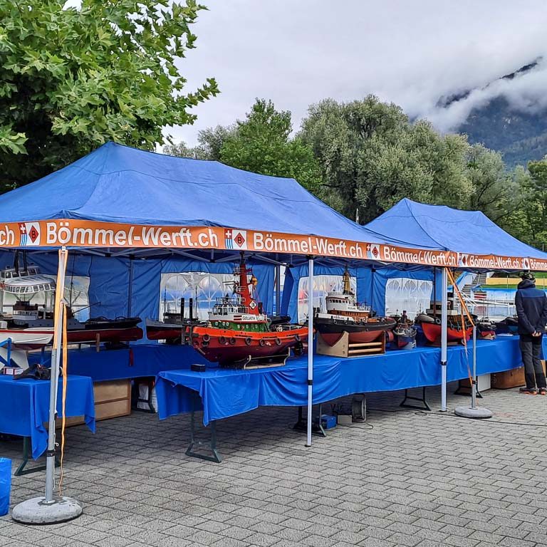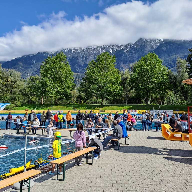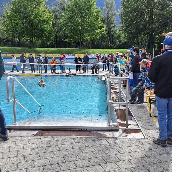 As we were planning a trip to Lake Constance, it made sense to stop by the SMC Rheintal’s showcase event. The gathering took place at the Schwimmbad Schaan/Vaduz in Liechtenstein. It’s a really beautiful swimming pool surrounded by snow-capped mountains. It was quite a coincidence that a winter cold snap had brought snow. Unfortunately, this negatively affected the temperatures; Saturday was really cold, but it didn’t dampen the participants‘ good spirits. We warmed up at the refreshment counter with some excellent coffee. There was also plenty of food and drink available. As Northern Germans, we had to get used to Swiss prices a bit. The variety of models on display was impressive; submarines are quite rare in the Alps—after all, they don’t really belong there. As submarine enthusiasts, we were particularly interested in Hans Peter’s shark model. We had never seen such a lifelike model in the water before. It could definitely startle a swimmer! All the major Swiss clubs had their own booths, so there was a lot to see. To entertain participants and spectators, four races were held with identical jet skis, which were really exciting. Sunday was sunny again, and the temperatures were just right. More participants and even more visitors showed up than the day before. The detour was worth it. We met many nice people.
