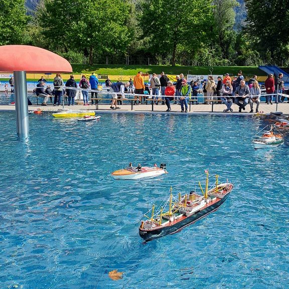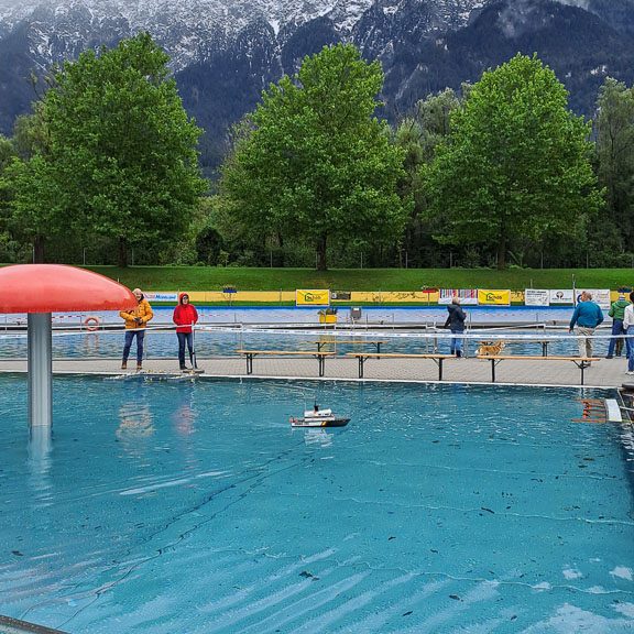 Da wir einen Trip zum Bodensee planten bot es sich an beim Schaufahren des SMC Rheintal herein zu schauen. Das Treffen findet im Schwimmbad Schaan/Vaduz in Lichtenstein statt. Ein wirklich schönes Schwimmbad, umgeben von Schnee bedeckten Bergen. Das war eher ein Zufall, ein Wintereinbruch hatte es schneien lassen. Leider wirkte sich das negativ auf die Temperaturen aus, der Samstag war echt kalt, was der guten Stimmung der Teilnehmer keinen Abbruch tat. Aufwärmen konnten wir uns an der Verpflegungstheke, mit einem sehr guten Kaffee. Auch sonst, war gut für Essen und Trinken gesorgt. An die Schweizer Preise muss man sich als Norddeutscher etwas gewöhnen. Die Vielfalt der Modelle war beeindruckend, Uboote sind eher selten in den Alpen, da gehören sie ja auch nicht wirklich hin. Als Ubootfahrer interessierte uns der Hai von Hans Peter besonders. Ein so lebensechtes Modell im Wasser haben wir noch nicht gesehen. Da kann sich ein Schwimmer schon sehr erschrecken. Alle großen Schweizer Clubs waren mit eigenen Ständen vertreten, so dass es viel zu sehen gab. Zur Unterhaltung der Teilnehmer und Zuschauer wurden vier Läufe eines Rennens mit identischen Jetskis ausgetragen, wirklich spannend. Sonntag war es wieder sonnig und die Temperaturen stimmten. Weitere Teilnehmer waren gekommen und noch mehr Besucher als am Vortag. Der Abstecher hat sich gelohnt, wir haben viele nette Leute kennen gelernt.