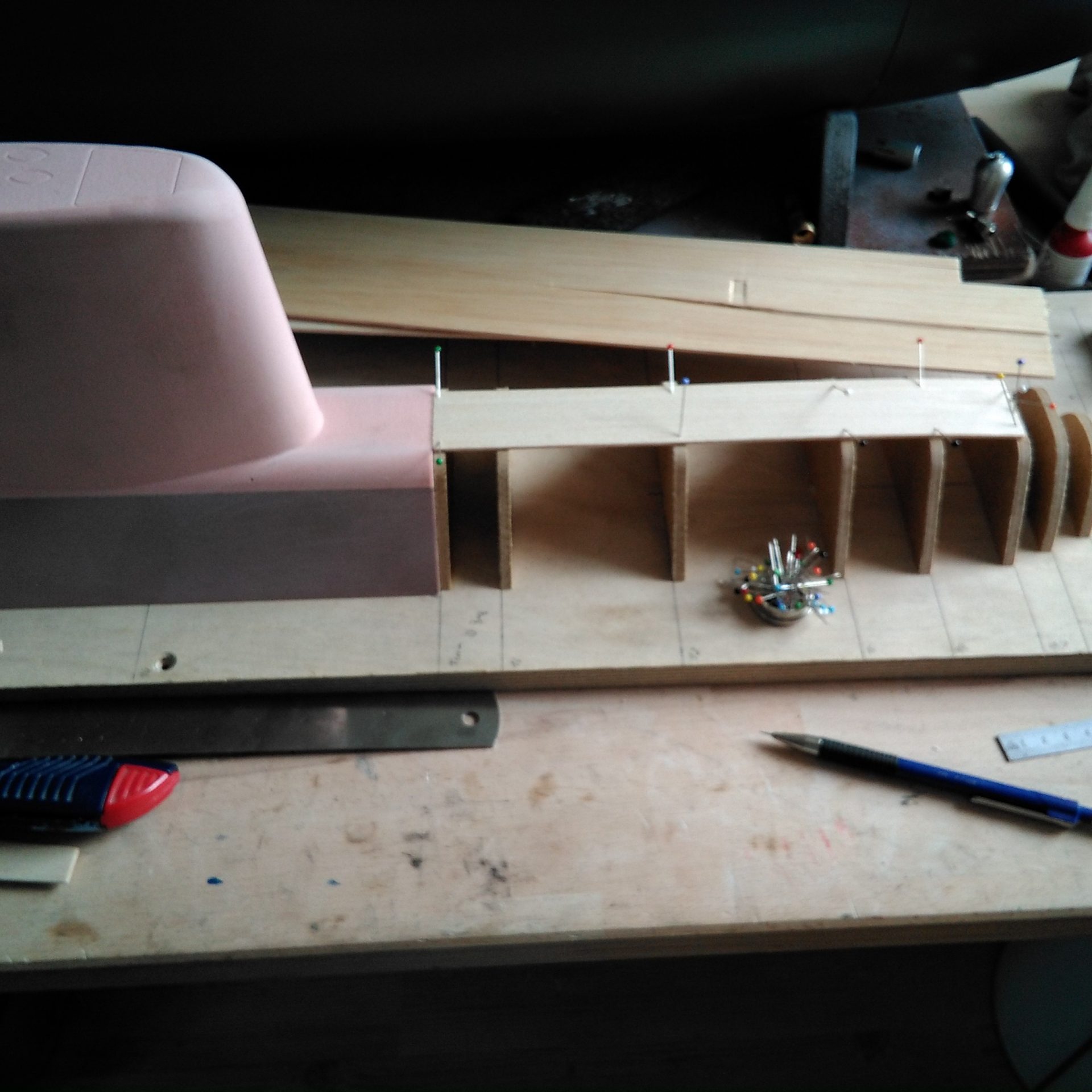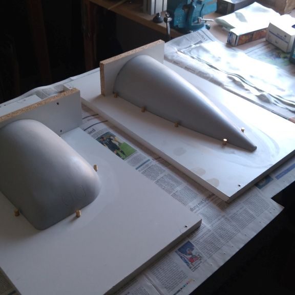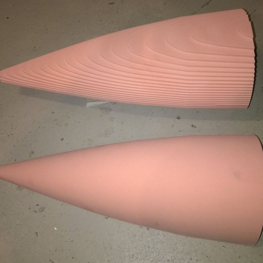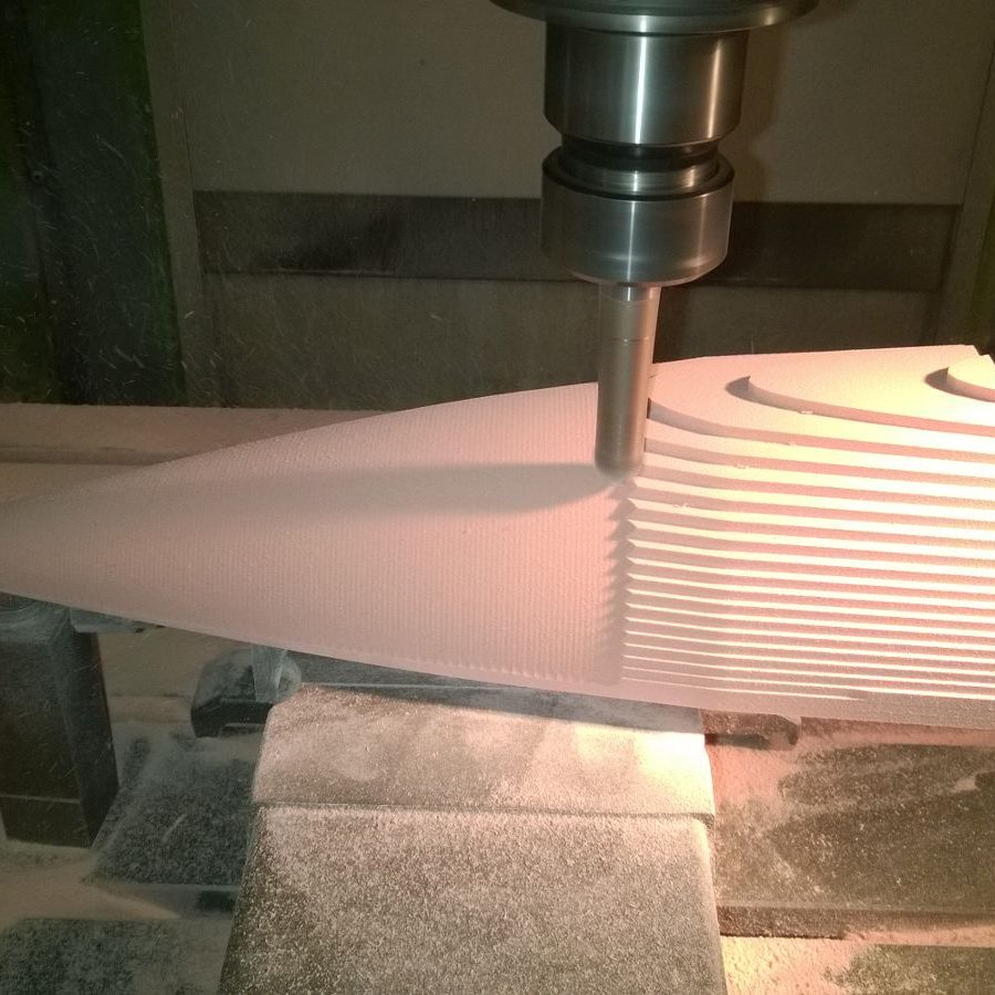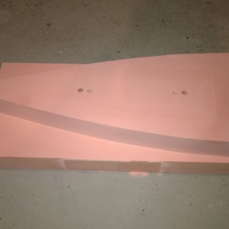 Die PU-Blöcke habe ich mit genügend Aufmaß auf der Kreissäge zugeschnitten. Alle Teile wurden zuerst grob geschruppt, danach mit einem Radiusfräser abgezeilt und zum Schluß fein geschlichtet. Das Ergebnis ist eine fast fertige Oberfläche die nur sehr wenig Nachschleifen erfordert.