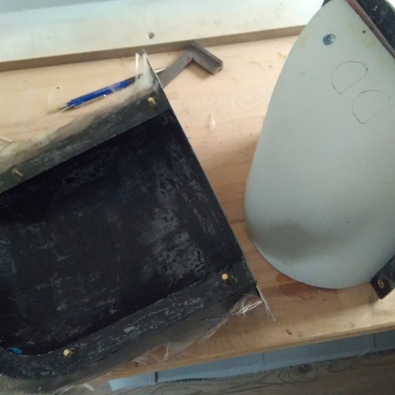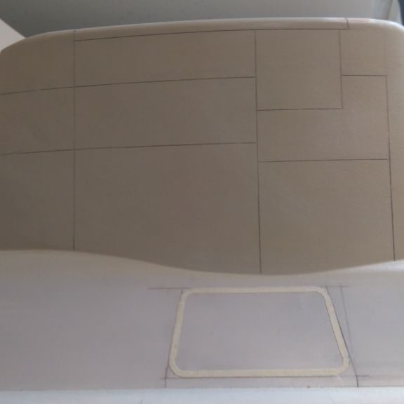 Die Sonarflächen an den Seiten habe ich mit Kreppband dargestellt, die markanten Dellen am Bug mit geätzem Gitter als Matritze und Aluklebeband als Ausgangsmaterial. Gearbeitet ist alles nach Bildern, die Pläne stimmen an vielen Stellen leider nicht. In der Zwischenzeit hatte Hans-Jürgen weiter an der CAD Zeichnung gearbeitet. Der Bug wurde nun auch langsam fertig. An der restlichen Konstruktion waren nur noch kleine Änderungen nötig geworden.