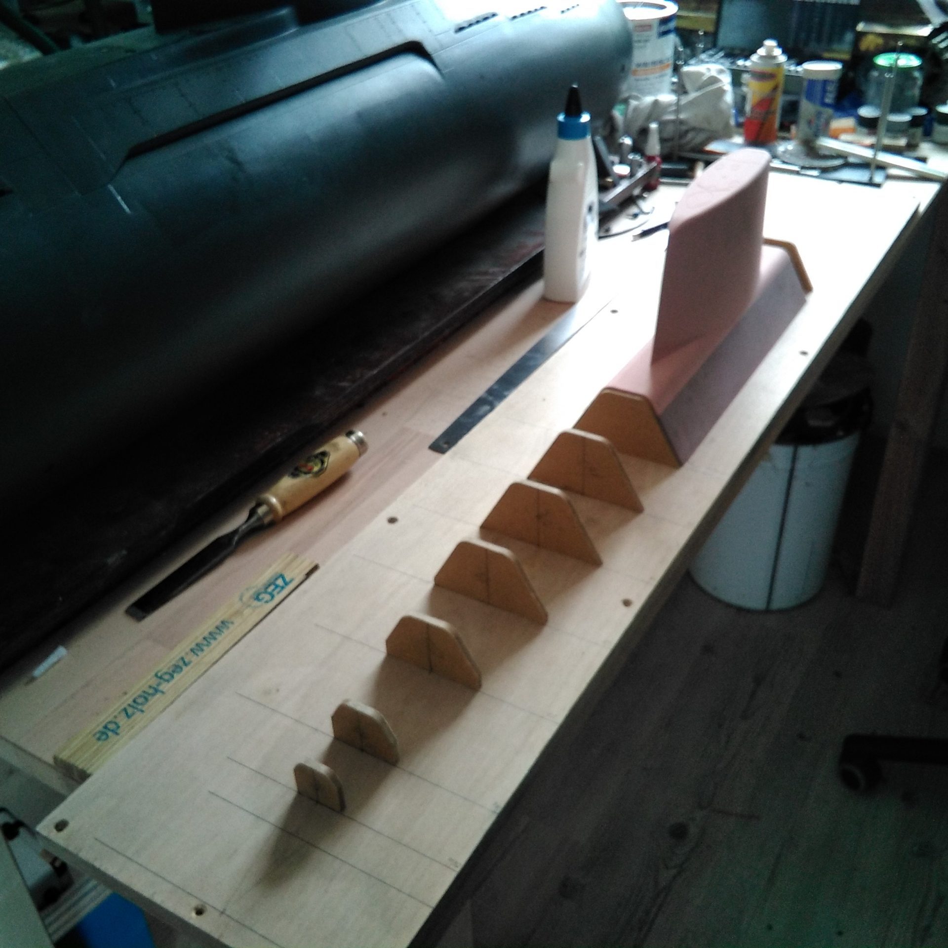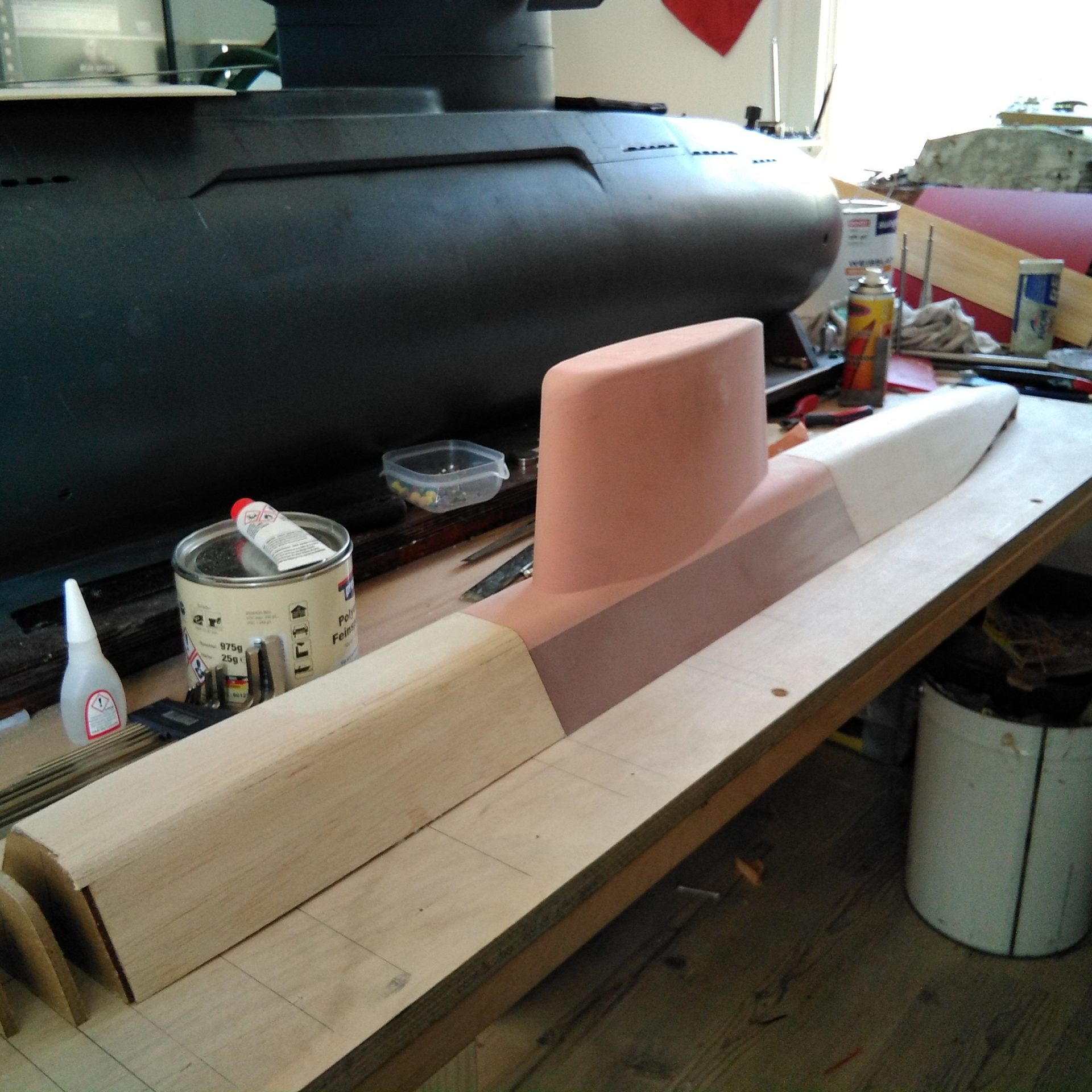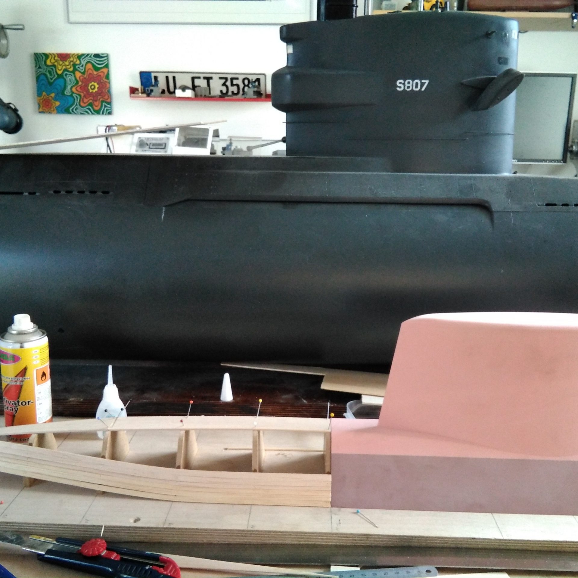 Hans-Jürgen hatte inzwischen noch das Deck und den Turm, so wie den Bug und das Heck als Zeichnung beigesteuert. Angefangen habe ich mit dem Deck. Die einzelnen Spanten konnte ich mir aus Hans-Jürgens Zeichnung ableiten und danach fräsen. Ausgerichtet und verklebt wurde alles auf einem Baubrett aus Multiplex. Den Turm und ein Teil des Decks hatte Egon ebenfalls aus Hartschaum gefräst. Dieser wurde direkt mit eingebaut. Beplankt habe ich die Spanten mit 2mm Balsa, danach folgt das obligatorische Spachteln und Schleifen der Oberfläche. Als letzte Schicht wurde Spritzspachtel aufgetragen, um die Details mit Schablonen einzugravieren. Im Hintergrund auf einigen Bildern zu sehen die Tijgerhaai, ebenfalls im Maßstab 1:30, hier ist schön zu erkennen welchen Größenunterschied die beiden Boote haben. Mit etwa 32kg wird TR-1700 ein handliches Pressluftboot das auch einmal alleine ins Wasser gebracht werden kann. Ganz im Gegensatz zu einer Tijgerhaai…