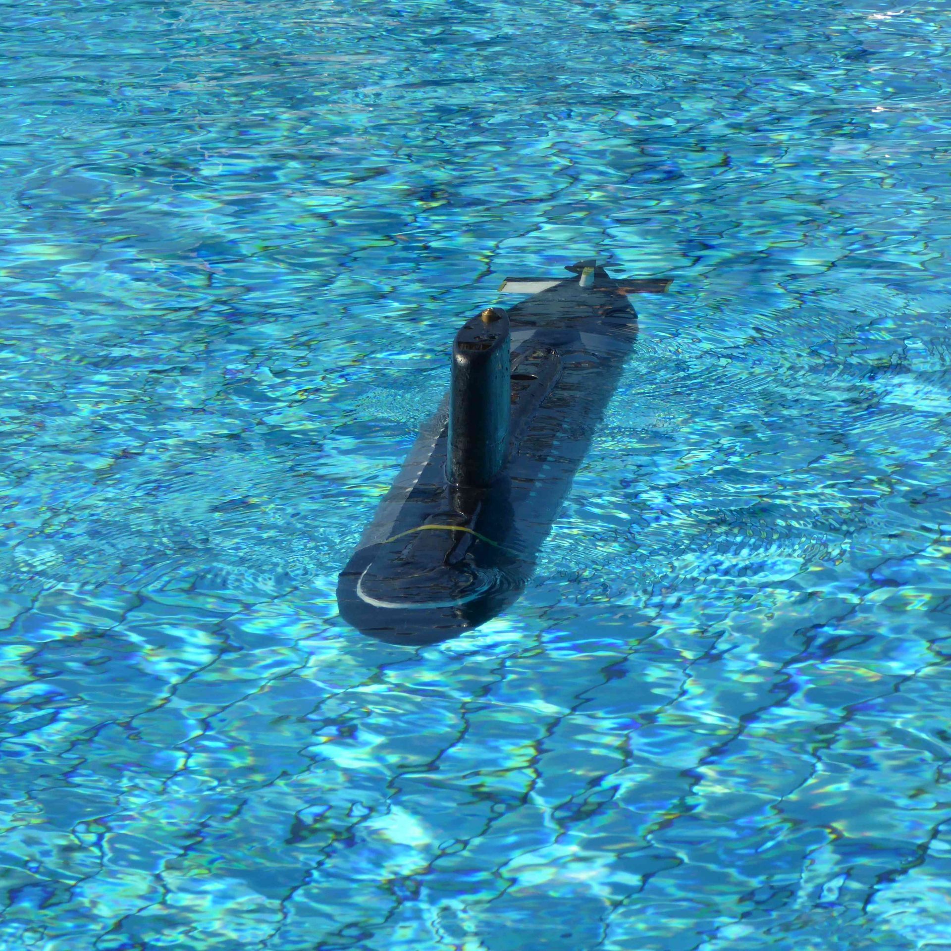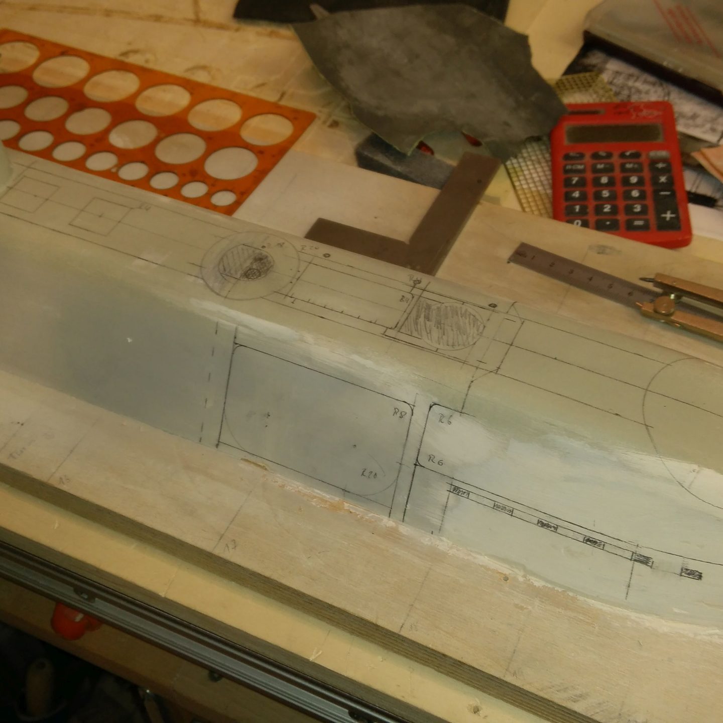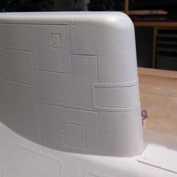 Hans-Jürgen hatte inzwischen noch das Deck und den Turm, so wie den Bug und das Heck als Zeichnung beigesteuert. Angefangen habe ich mit dem Deck. Die einzelnen Spanten konnte ich mir aus Hans-Jürgens Zeichnung ableiten und danach fräsen. Ausgerichtet und verklebt wurde alles auf einem Baubrett aus Multiplex. Den Turm und ein Teil des Decks hatte Egon ebenfalls aus Hartschaum gefräst. Dieser wurde direkt mit eingebaut. Beplankt habe ich die Spanten mit 2mm Balsa, danach folgt das obligatorische Spachteln und Schleifen der Oberfläche. Als letzte Schicht wurde Spritzspachtel aufgetragen, um die Details mit Schablonen einzugravieren. Im Hintergrund auf einigen Bildern zu sehen die Tijgerhaai, ebenfalls im Maßstab 1:30, hier ist schön zu erkennen welchen Größenunterschied die beiden Boote haben. Mit etwa 32kg wird TR-1700 ein handliches Pressluftboot das auch einmal alleine ins Wasser gebracht werden kann. Ganz im Gegensatz zu einer Tijgerhaai…