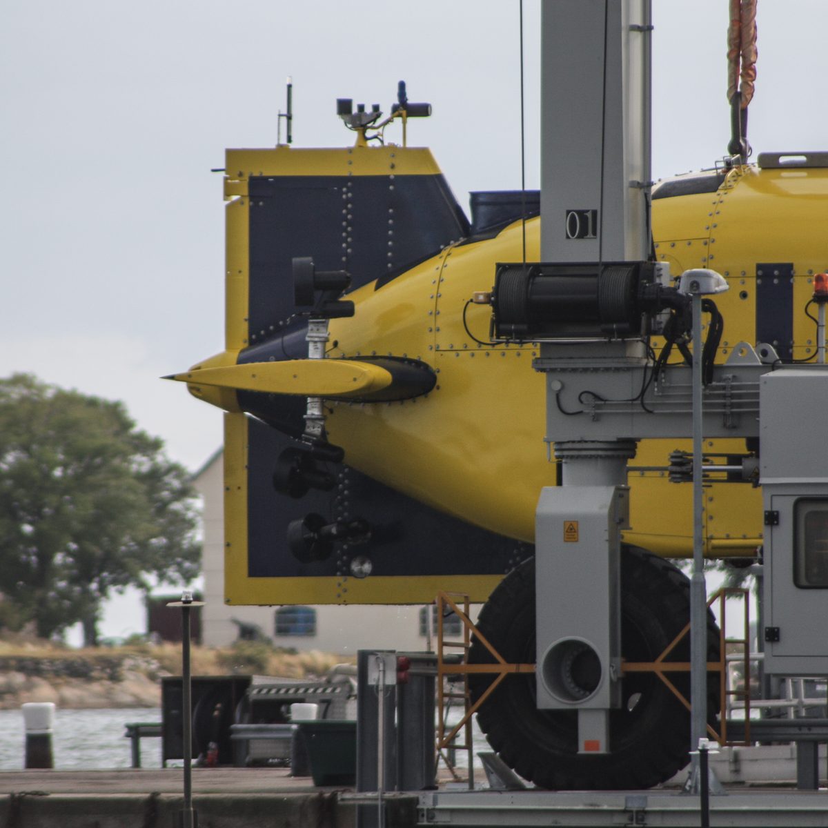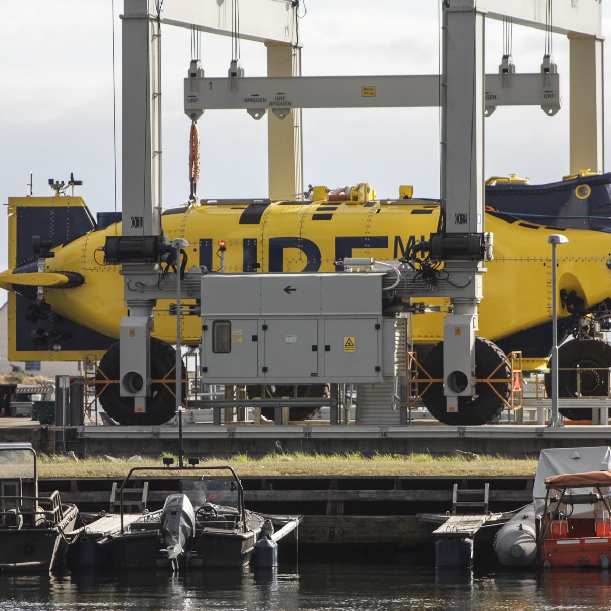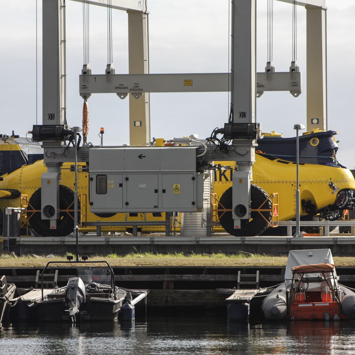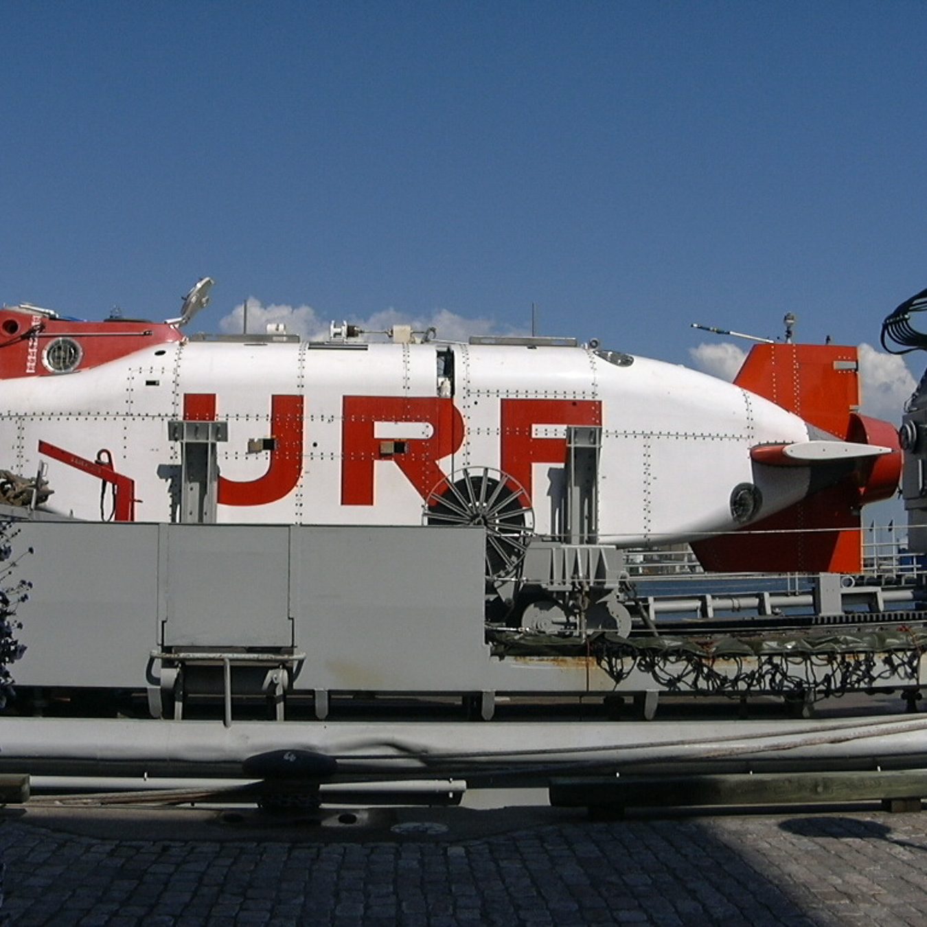 In der Nähe der Hafeneinfahrt stoppte es und ein Mann vom Begleitboot öffnete eine Luke. Zwei Mann kamen heraus, wir hatten immer noch keine Ahnung was es sein konnte. Man stieg wieder ein und das Gefährt bewegte sich in ein Dock im Hafen, eine Hebevorrichtung wurde in Betrieb gesetzt und das Uboot aus dem Wasser gehoben. Das ist ja URF, wir waren total überrascht, es hatte sich sehr verändert. Anstatt weiß-rot war es nun blau-gelb lackiert. Die Kortdüse am Heck ist verschwunden, statt dessen gibt es jetzt sechs verstellbare Thruster am Heck. Auch der Frontbereich wurde an jeder Seite mit einem verstellbaren Thruster ausgestattet. Nachdem das URF vollständig aus dem Wasser gehoben war wurde es in der selbstfahrbaren Vorrichtung zu seinem Stellplatz an Land gefahren.
