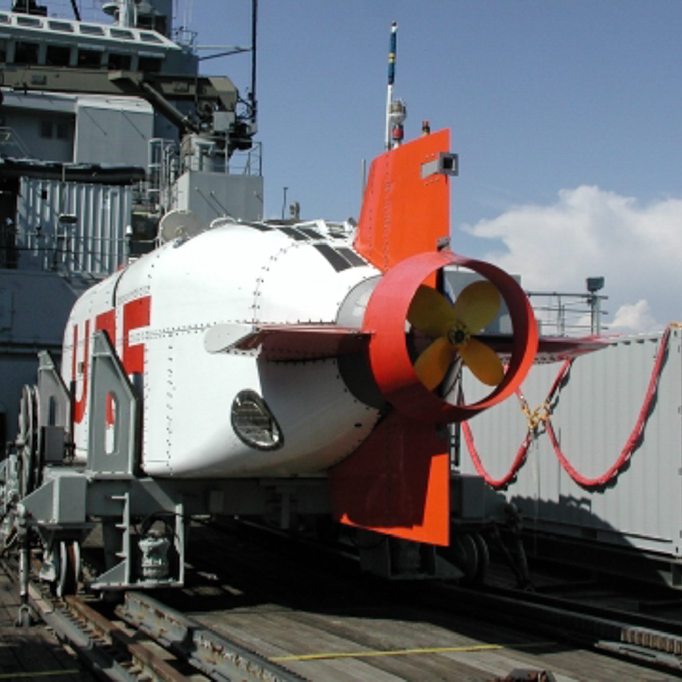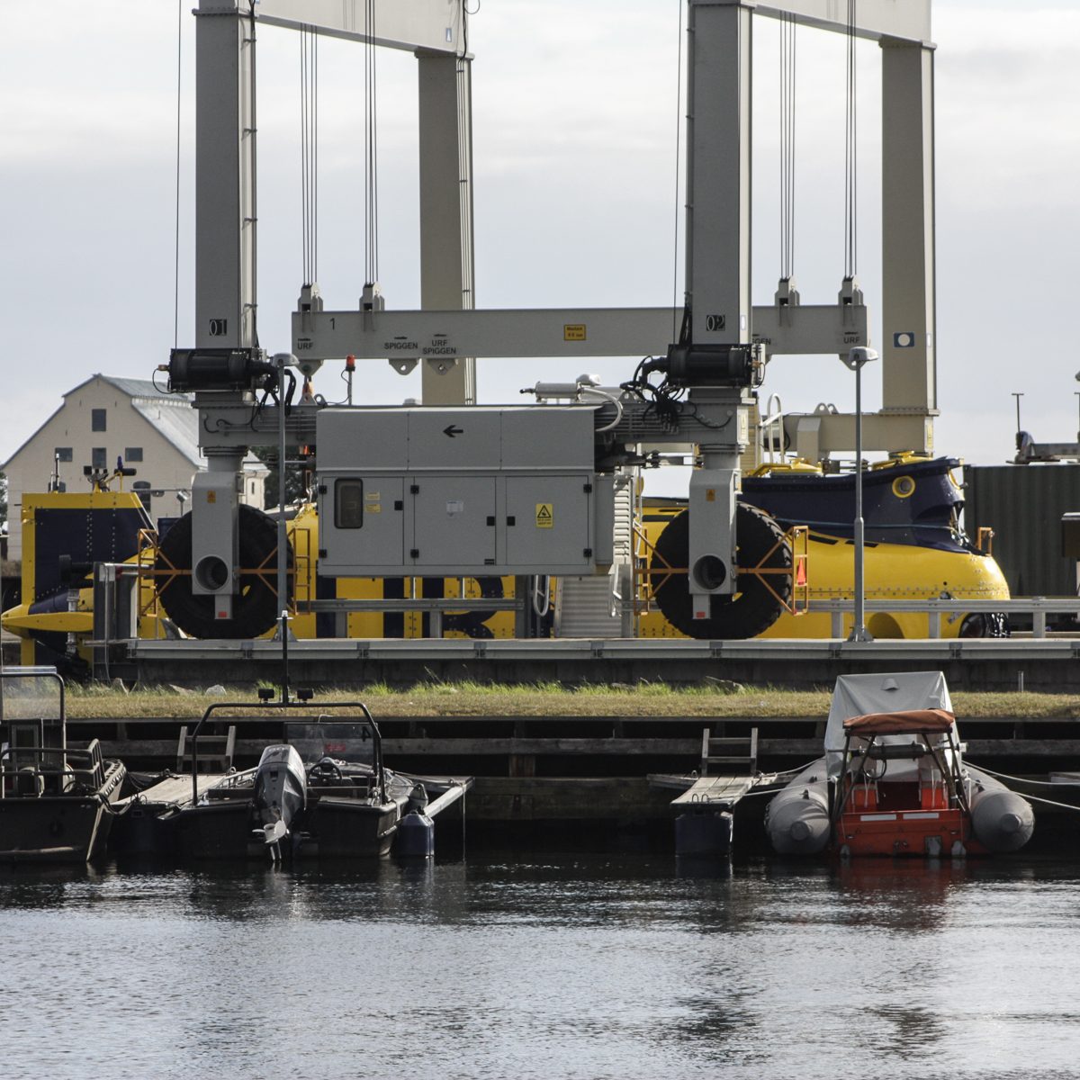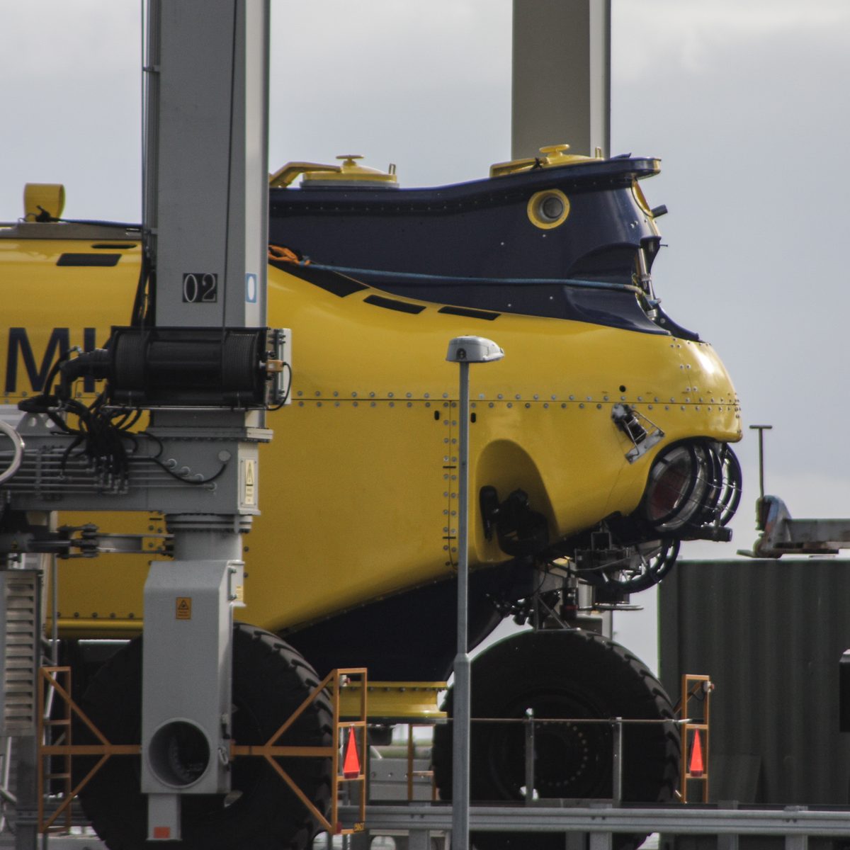 In der Nähe der Hafeneinfahrt stoppte es und ein Mann vom Begleitboot öffnete eine Luke. Zwei Mann kamen heraus, wir hatten immer noch keine Ahnung was es sein konnte. Man stieg wieder ein und das Gefährt bewegte sich in ein Dock im Hafen, eine Hebevorrichtung wurde in Betrieb gesetzt und das Uboot aus dem Wasser gehoben. Das ist ja URF, wir waren total überrascht, es hatte sich sehr verändert. Anstatt weiß-rot war es nun blau-gelb lackiert. Die Kortdüse am Heck ist verschwunden, statt dessen gibt es jetzt sechs verstellbare Thruster am Heck. Auch der Frontbereich wurde an jeder Seite mit einem verstellbaren Thruster ausgestattet. Nachdem das URF vollständig aus dem Wasser gehoben war wurde es in der selbstfahrbaren Vorrichtung zu seinem Stellplatz an Land gefahren.