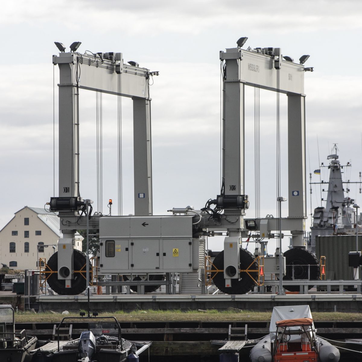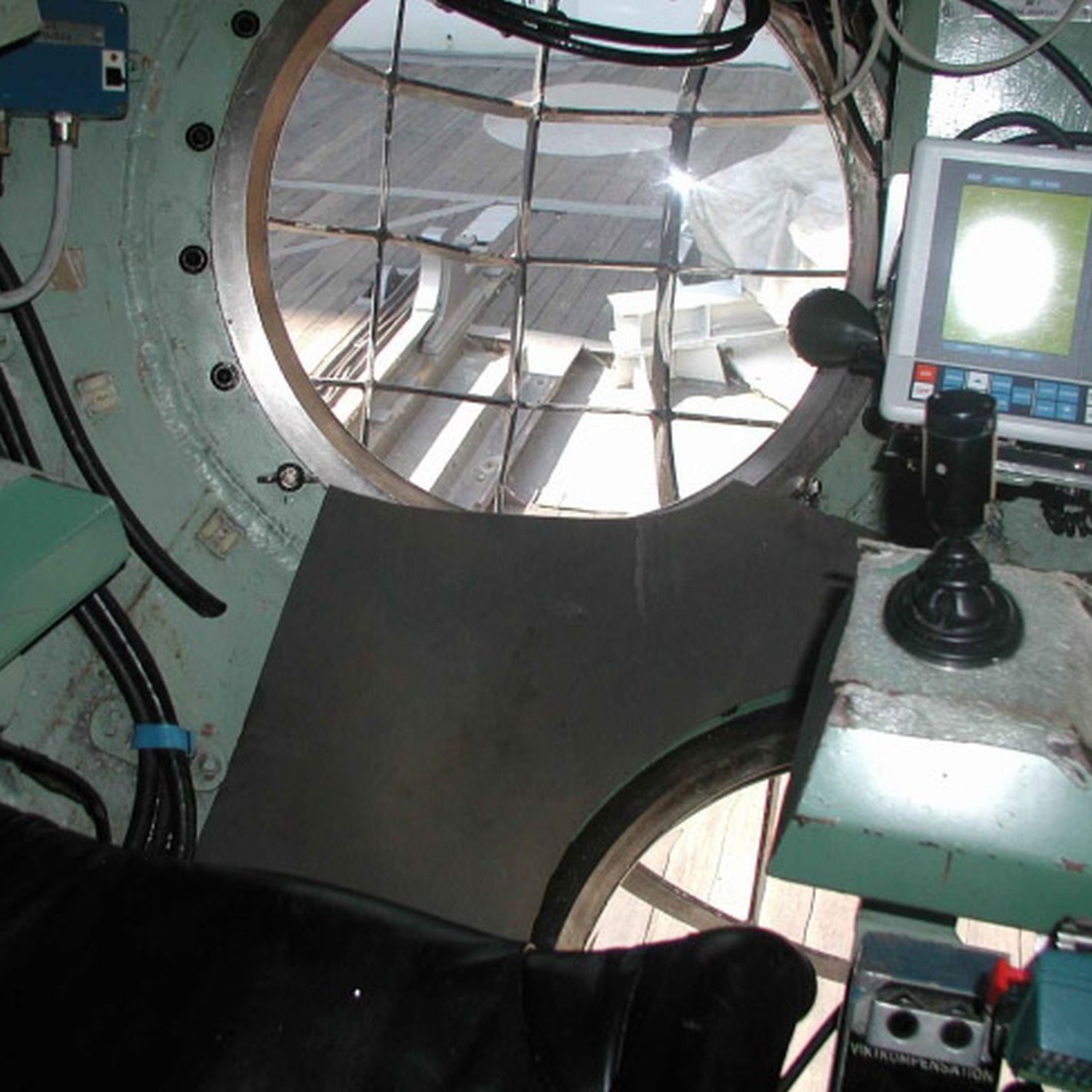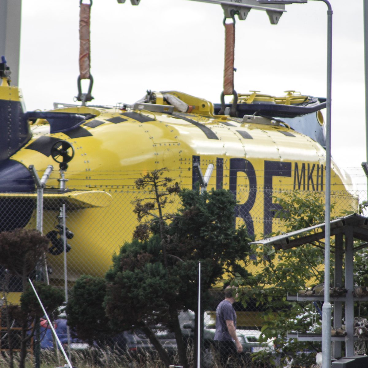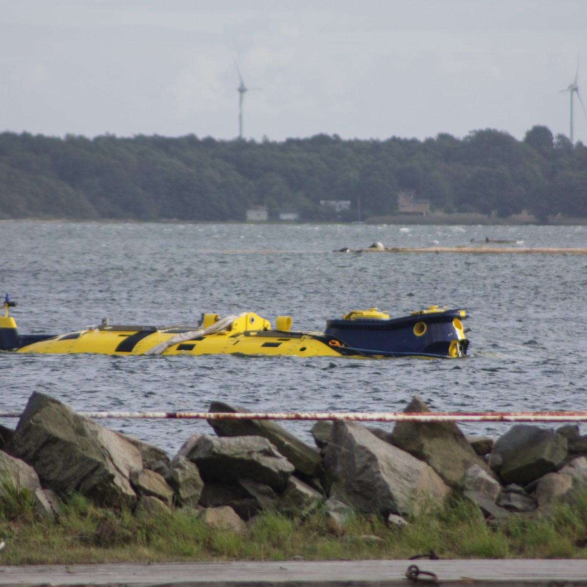 In der Nähe der Hafeneinfahrt stoppte es und ein Mann vom Begleitboot öffnete eine Luke. Zwei Mann kamen heraus, wir hatten immer noch keine Ahnung was es sein konnte. Man stieg wieder ein und das Gefährt bewegte sich in ein Dock im Hafen, eine Hebevorrichtung wurde in Betrieb gesetzt und das Uboot aus dem Wasser gehoben. Das ist ja URF, wir waren total überrascht, es hatte sich sehr verändert. Anstatt weiß-rot war es nun blau-gelb lackiert. Die Kortdüse am Heck ist verschwunden, statt dessen gibt es jetzt sechs verstellbare Thruster am Heck. Auch der Frontbereich wurde an jeder Seite mit einem verstellbaren Thruster ausgestattet. Nachdem das URF vollständig aus dem Wasser gehoben war wurde es in der selbstfahrbaren Vorrichtung zu seinem Stellplatz an Land gefahren.