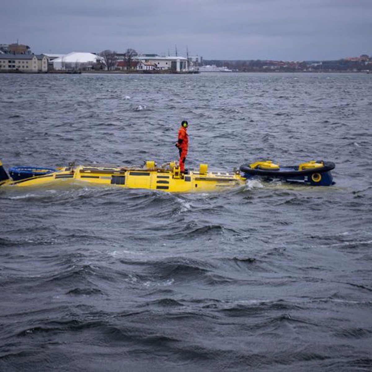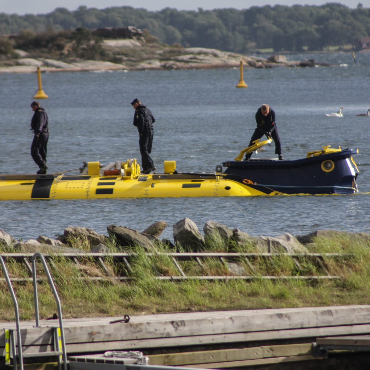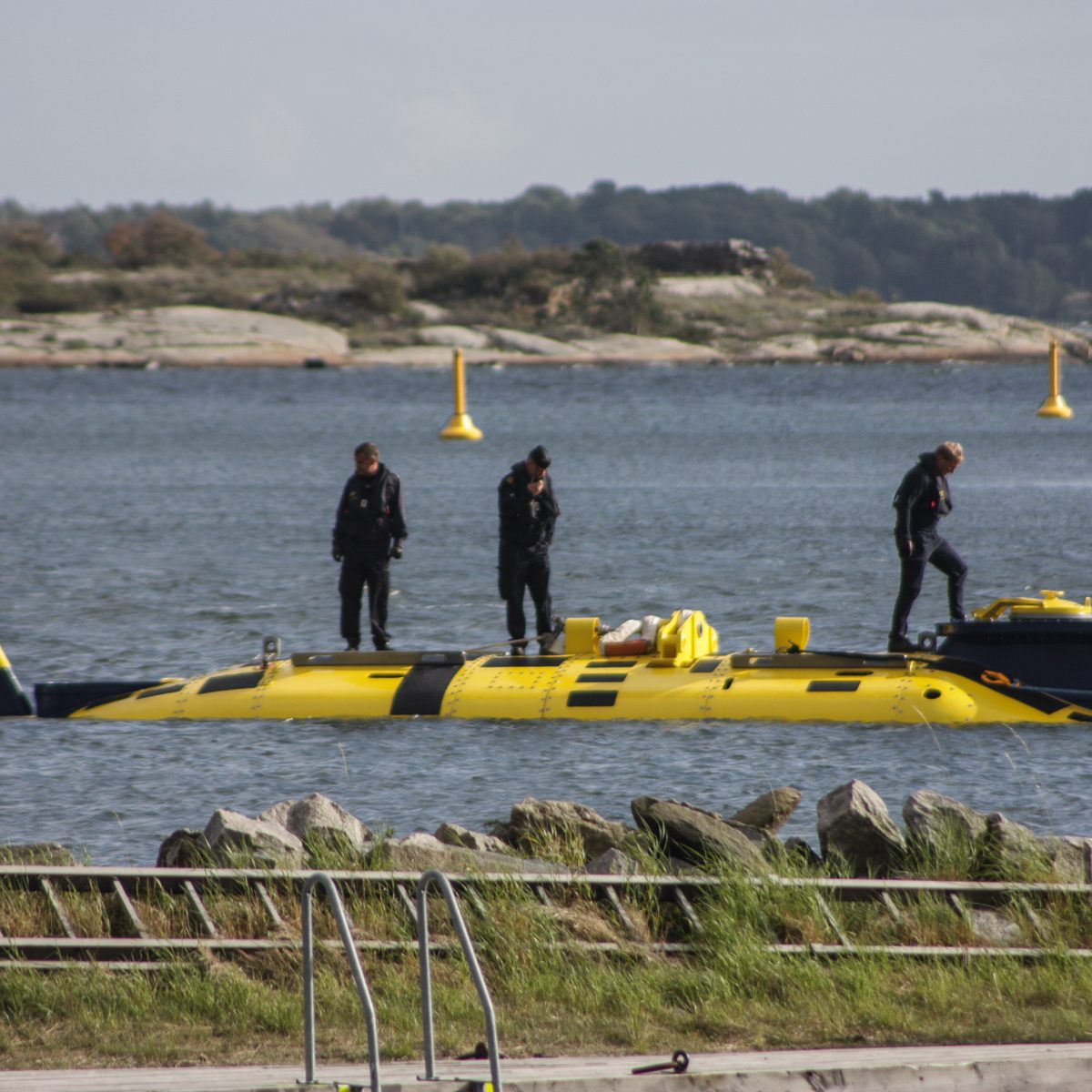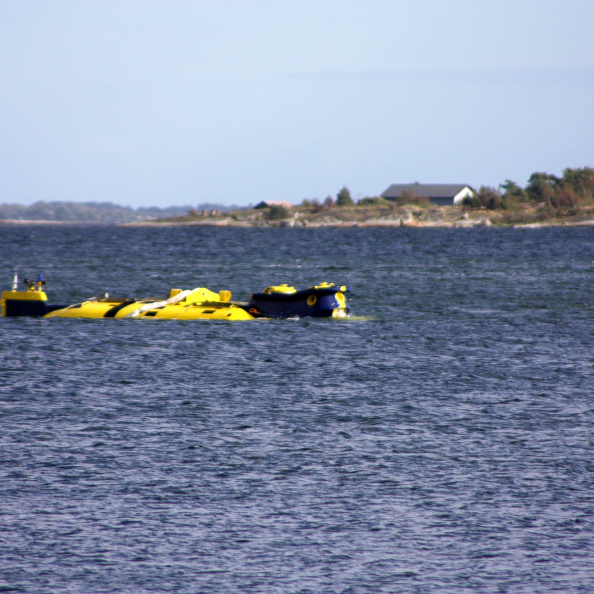 Dann sahen wir draussen zwischen den Schären etwas gelbes, eine Boje dachten wir zuerst, aber das Teil kam an der Seite eines Begleitbootes langsam näher. Irgendwann war es so nah, das man eine blaue Nase erkennen konnte. Was mag das sein? Dabei hätten wir es erkennen können. Wir hatten es schon früher besichtigt.